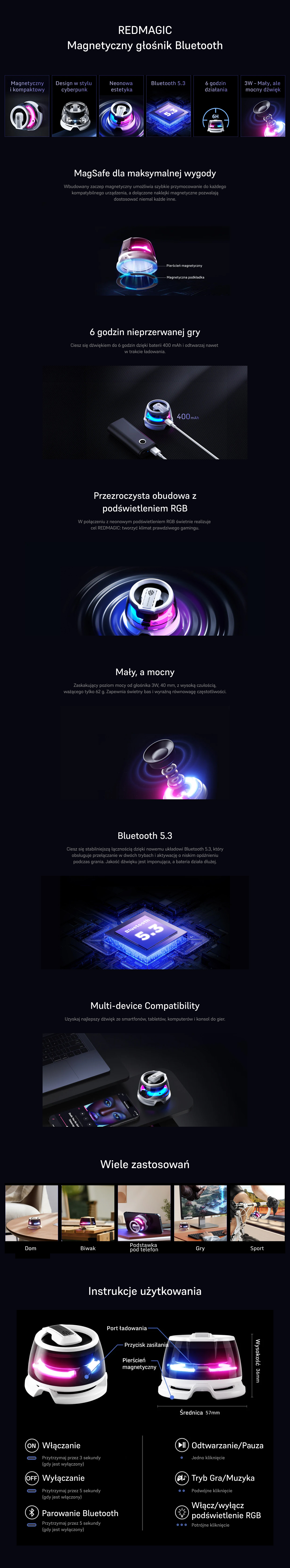 Parametry techniczne Materiał: Plastik, tworzywo sztuczne Moc głośników: 3W Rozmiar sterownika:40mm Bateria: 400 mAh Złącze: USB-C Zasięg: Do 10 metrów Podświetlenie RGB Wymiary :57 x 36 mm Waga: Około 62