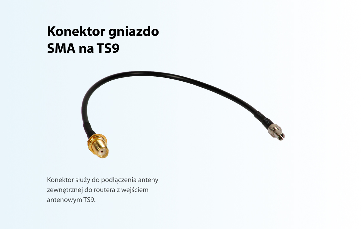 Konektor umożliwia podłączenie anteny zewnętrznej 5G DIPOL TRANS DATA wzmacniajacej sygnał operatora komórkowego 5G i LTE do routera z gniazdem TS9.