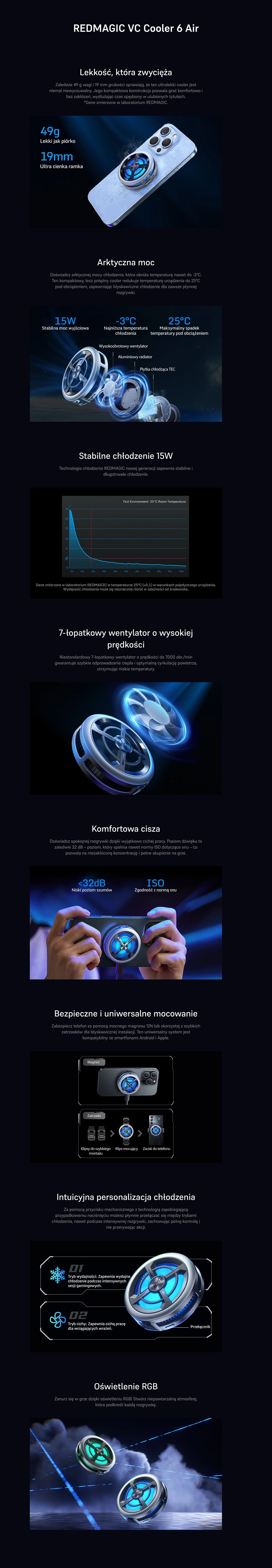 Parametry techniczne | Kompatybilność: Pasuje do każdego modelu telefonu o szerokości od 70 do 85 mm. Złącze: USB-C Kolor: Srebrny, szary Maksymalna prędkość obrotowa: 7000 obr./min Moc: 15W Poziom hałasu: 32 dB Dodatkowe informacje: Oświetlenie RGB, specjalny wentylator o 7 łopatkach i prędkości do 7000 obr./min, który zapewnia chłód i wygodę dłoni, Obniża temperaturę do 25°C pod obciążeniem. Szybkie chłodzenie dla płynnej gry. Waga: Około 49 g (bez klipsa) Grubość: Około 19 mm |