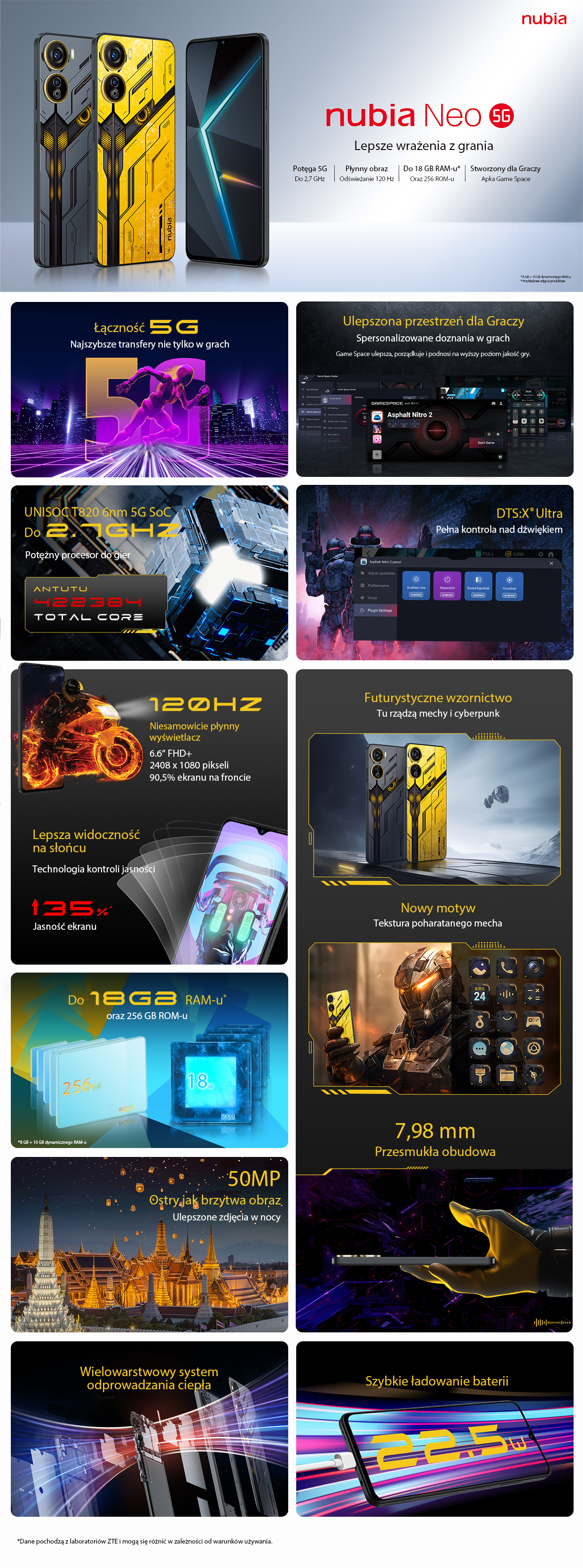Smartfon nubia Neo 5G to sprzęt dedykowany wymagającym zawodnikom, którzy oczekują świetnych wyników. Szybki procesor, bajeczny wyświetlacz, unikatowe wzornictwo i komplet dodatków takich jak: 5G, NFC, Game Space i szybkie ładowanie zapewniają najlepsze wrażenia z gry.