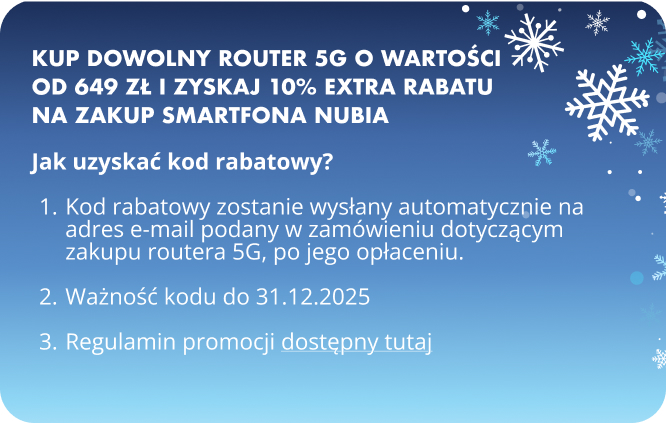 | Informacja dodatkowa | Nazwa oprogramowania: oprogramowanie własne Sposób instalacji: oprogramowanie preinstalowane w urządzeniu bez możliwości instalacji lub reinstalacji przez użytkownika Kompatybilność: routery z funkcją Wifi - działają z każdym urządzeniem z WIFI. Routery typu tylko ODU - działają z każdym urządzeniem mającym port LAN RJ45. Routery USB- działają z każdym urządzeniem wyposażonym w port USB i opartym na systemie Windows lub MAC OS. Częstotliwość aktualizacji: aktualizacje wypuszczane są wg uznania producenta w celu naprawy wykrytych błędów lub wprowadzenia zmian ustawień w tym nowych funkcji. |