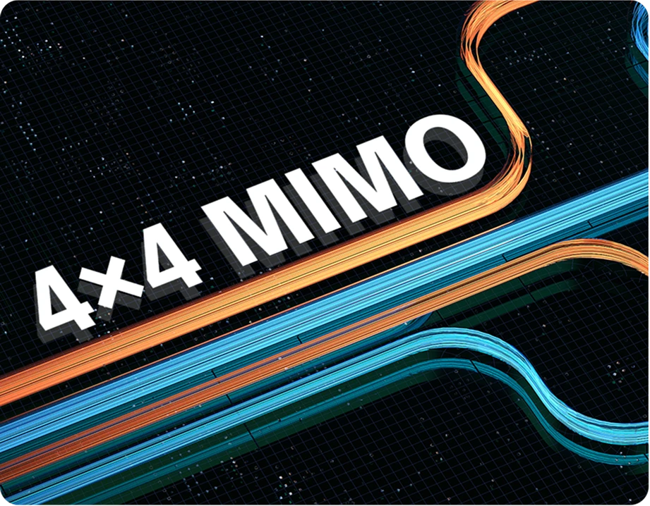 Technologia 4×4 MIMO podwaja przepustowość w pasmach wysokich, średnich i niskich, przyspieszając transmisję danych oraz zapewniając płynną, wydajną i niezawodną łączność.